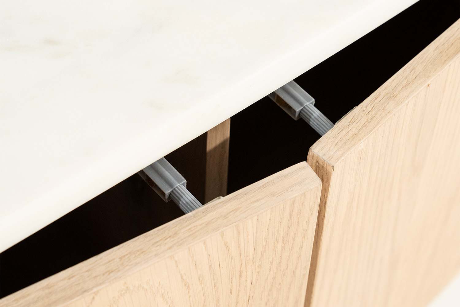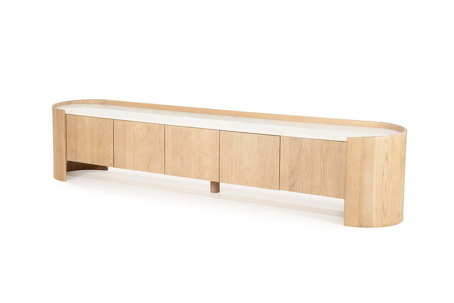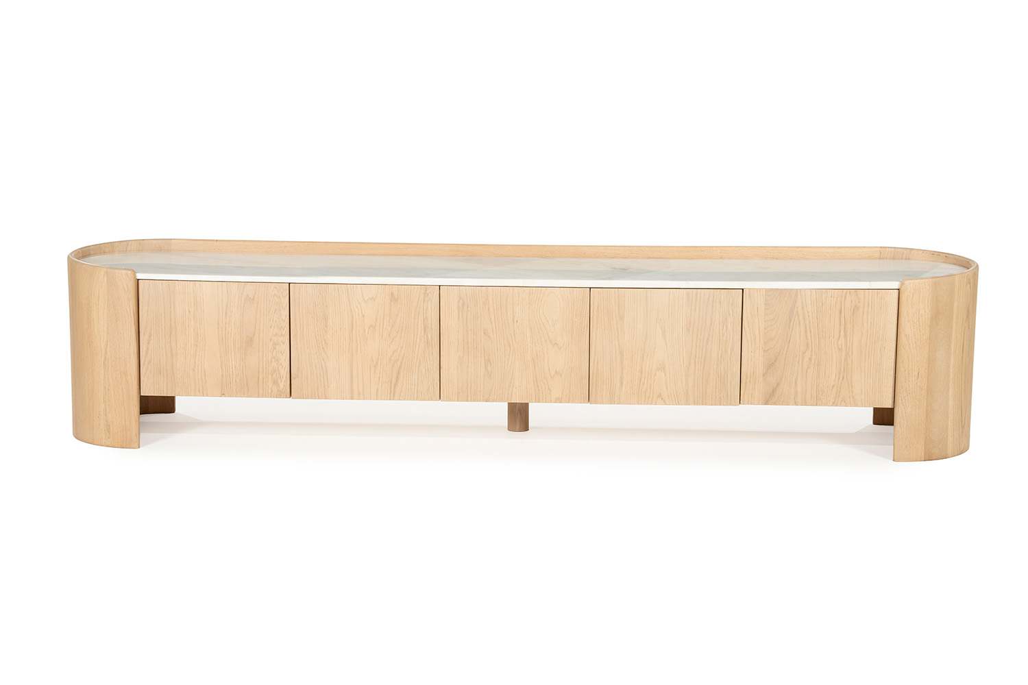 Maak kennis met de perfecte aanvulling voor je woonkamer: een stijlvol en functioneel tv-meubel van 240 cm breed. Dit meubelstuk is gemaakt van hoogwaardig eikenhout en marmer, wat zorgt voor een natuurlijke en warme uitstraling. De lichte houttint past moeiteloos in elke interieurstijl, van Scandinavisch tot modern.