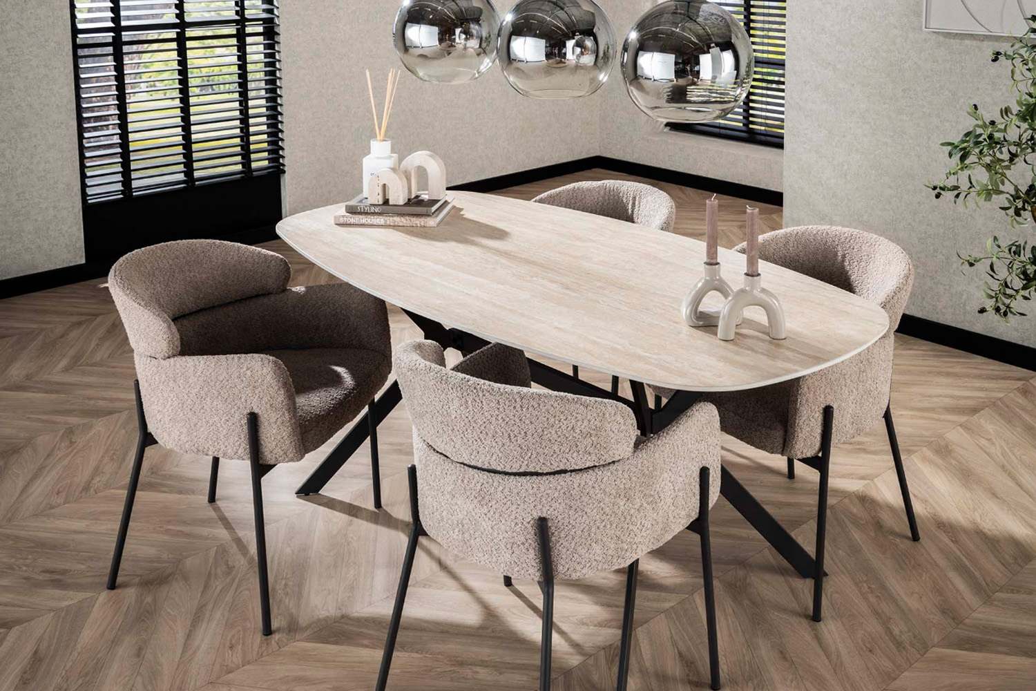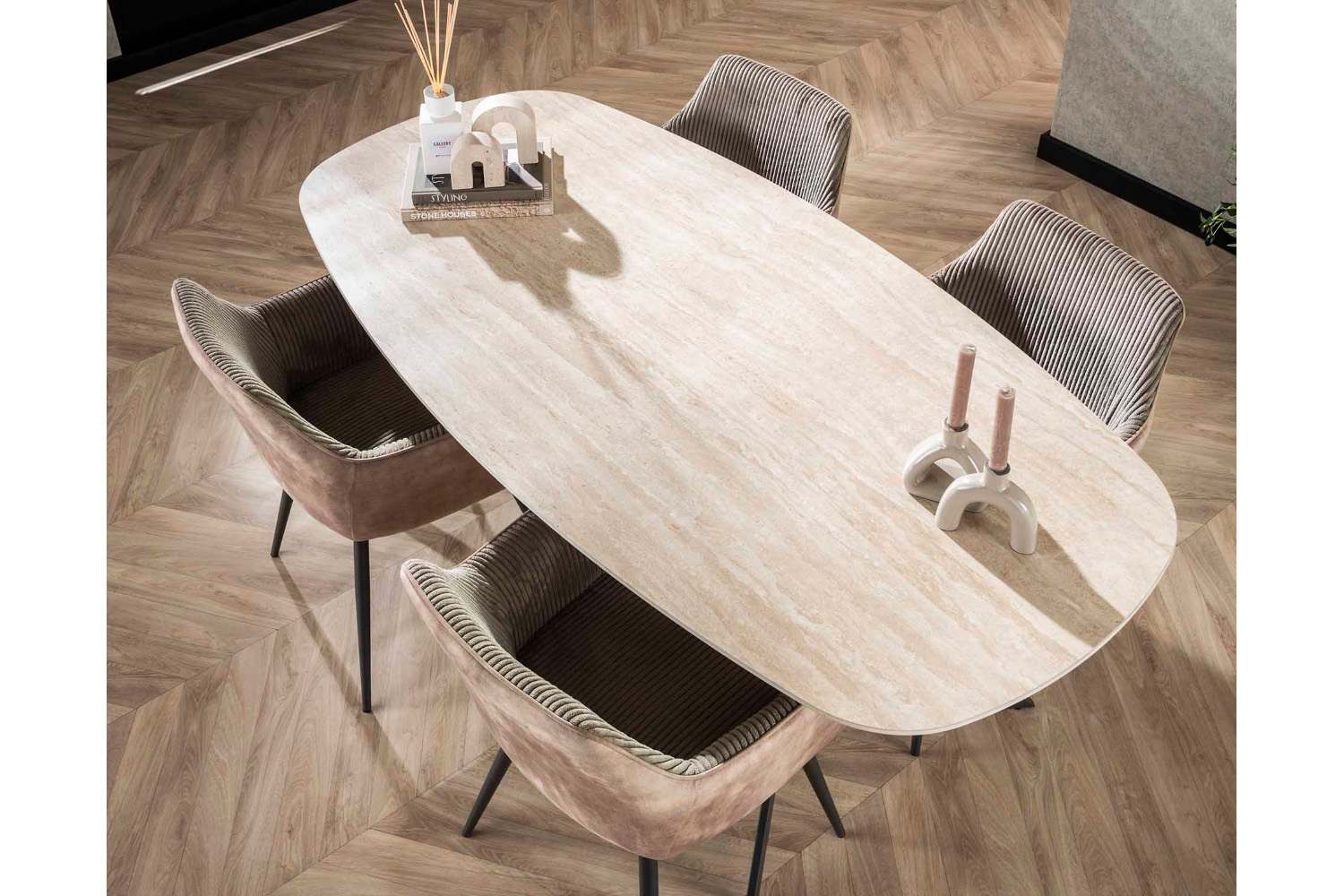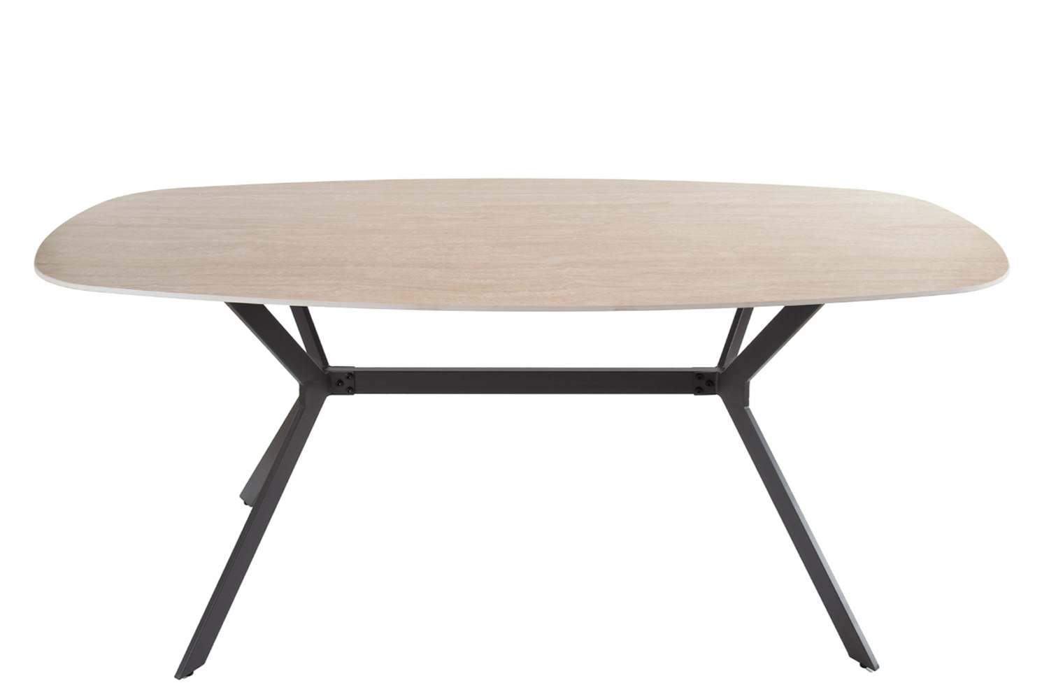 Eetkamertafel Romano is een Deens ovale tafel van 180 cm breed, uitgevoerd met een keramiek blad in travertin-look. Het blad rust op een stevig frame van gepoedercoat staal. Keramiek is krasbestendig, vlekwerend en bestand tegen hoge temperaturen, waardoor het uitermate geschikt is voor intensief gebruik zonder speciaal onderhoud. Ontdek alle artikelen uit de Romano serie.