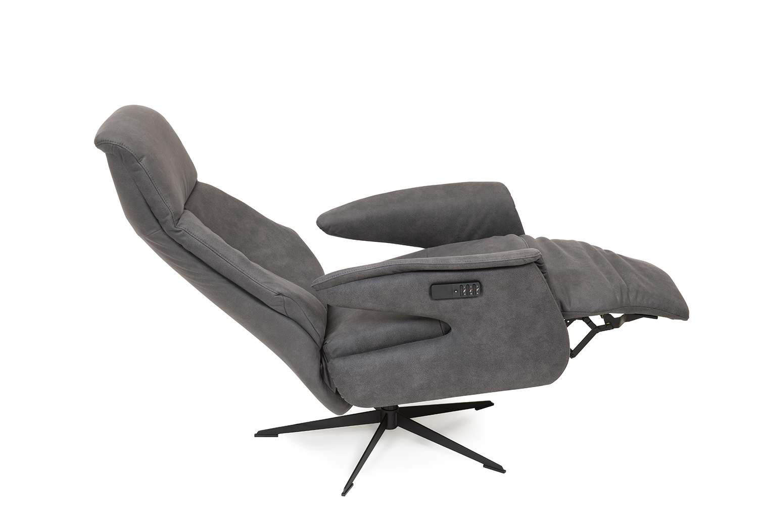 De fauteuil 14764, gemaakt van Kentucky stof, is voorzien van een elektrische relaxfunctie, uitgerust met drie motoren, waarmee je het nekgedeelte, de voetenbank en de rug afzonderlijk kunt bedienen.