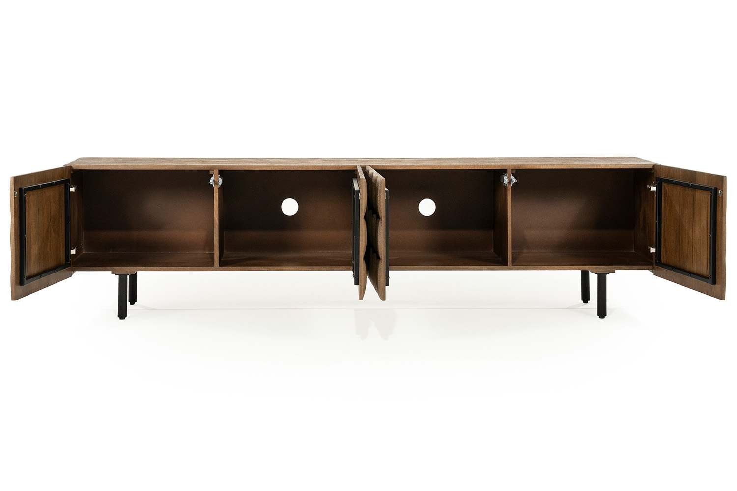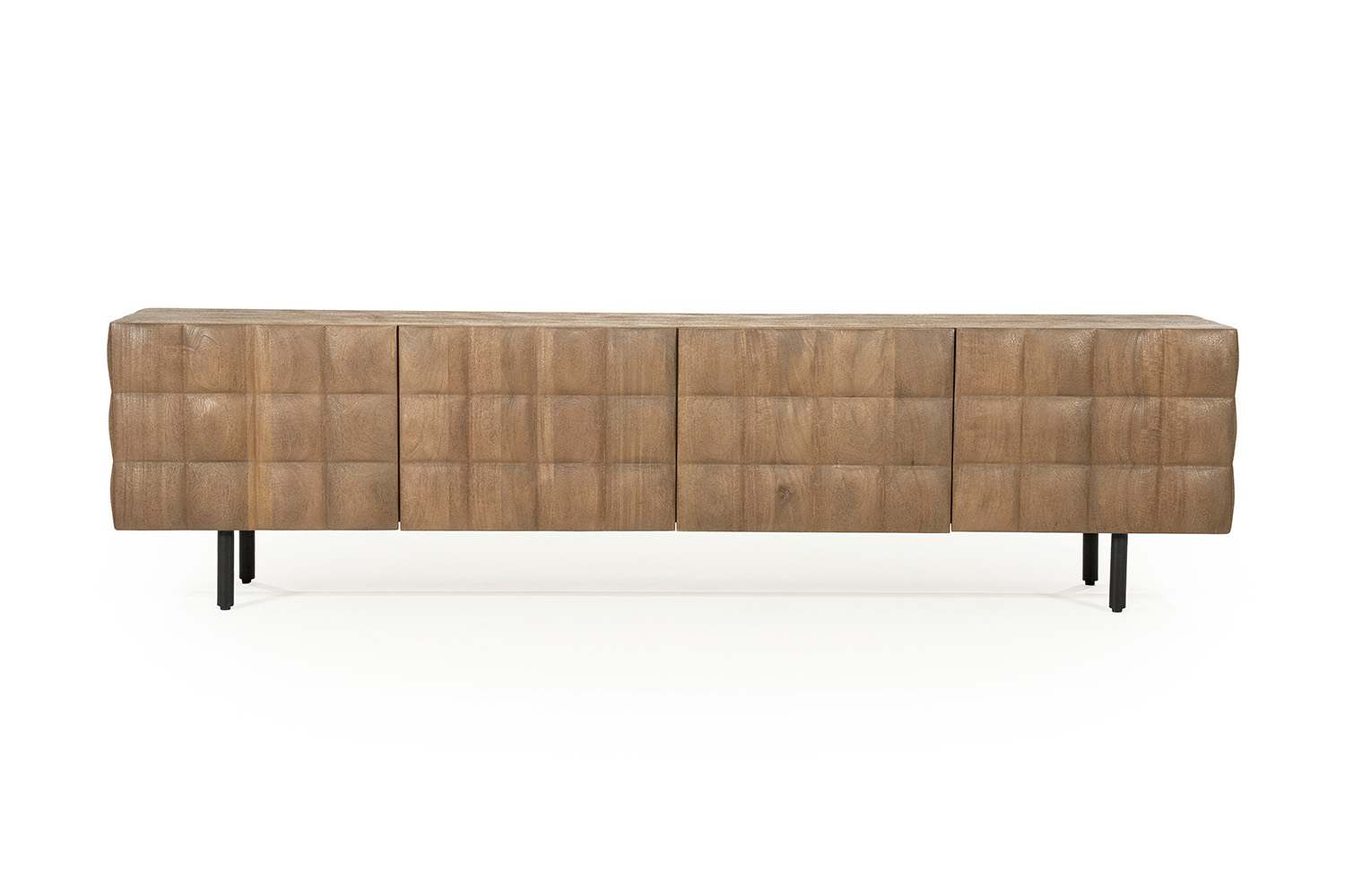 Het Felix TV-meubel combineert stoer met stijlvol dankzij de robuuste materialen en strakke vormgeving. Het gelakte mangohout straalt warmte uit, terwijl het zwart gecoate metalen frame het meubel een industriële uitstraling geeft. Met zijn breedte van 214 cm is er volop ruimte voor je televisie en accessoires, en achter de drie deuren kun je alles netjes uit het zicht opbergen. De slanke poten van 15,5 cm geven het meubel een luchtige look, waardoor het ook in kleinere ruimtes goed tot zijn recht komt.
