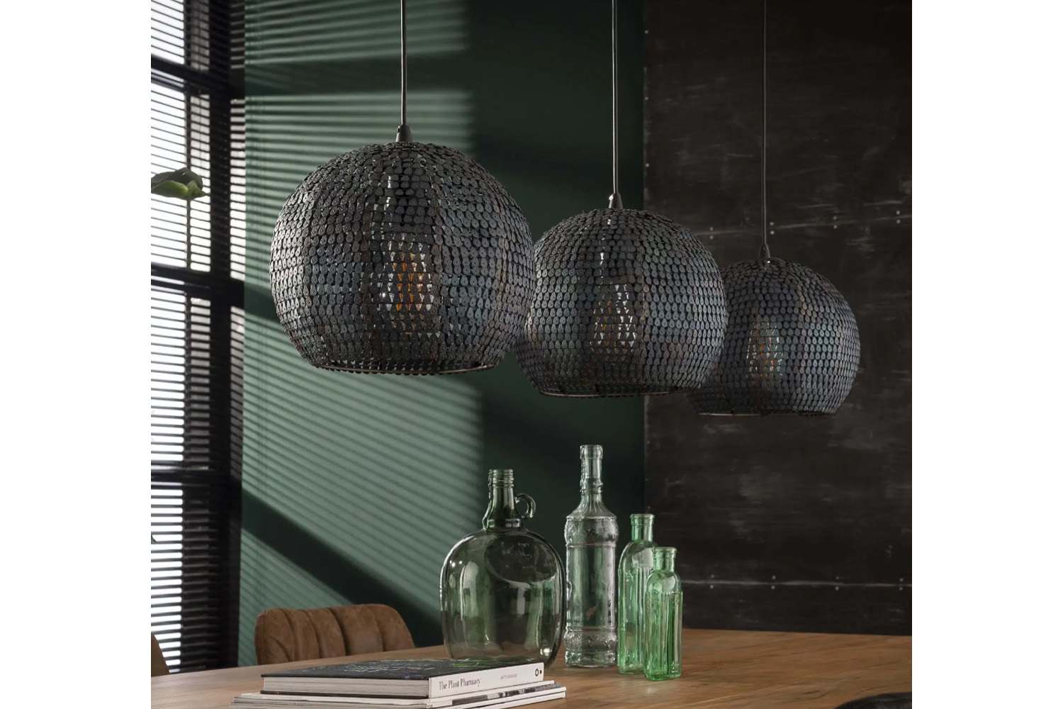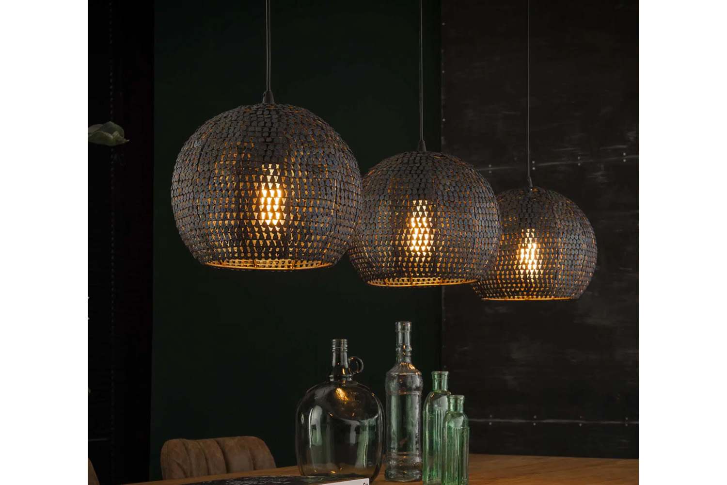 De Armor hanglamp heeft drie ronde metalen kappen. De gehele lamp is afgewerkt in een burned finish. Dit geeft een zwart/bruine kleur. De lamp is volledig handgemaakt en hierdoor is elke lamp uniek. De gaatjes maken deze lamp semi-transparant, waardoor het licht sfeervol door de ruimte wordt verdeeld. Iedere kap is afzonderlijk in hoogte verstelbaar tot 150 cm.