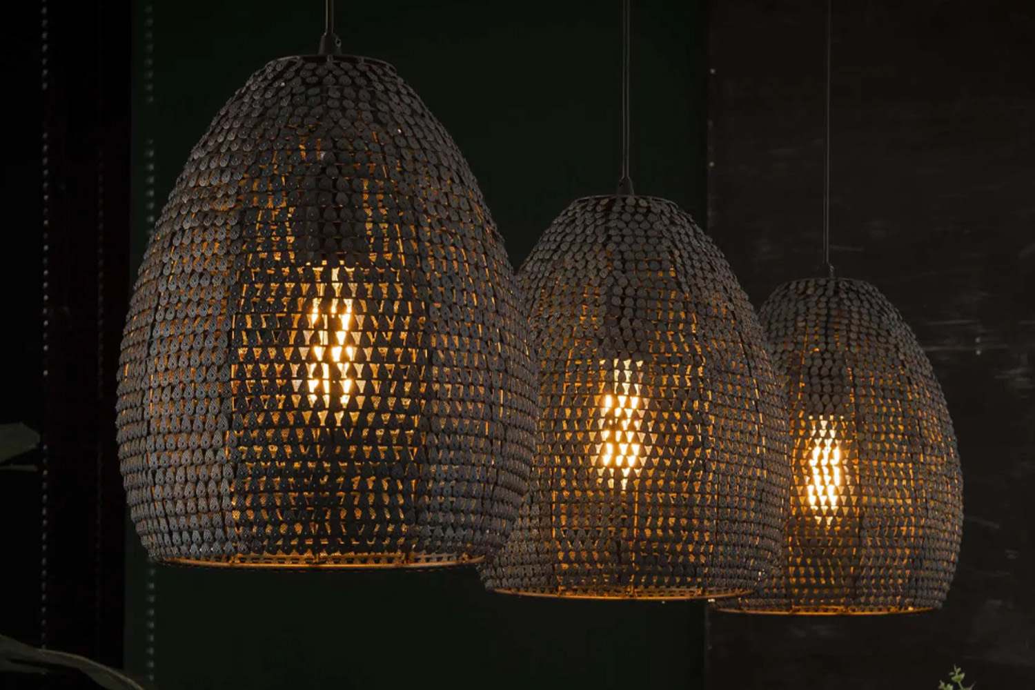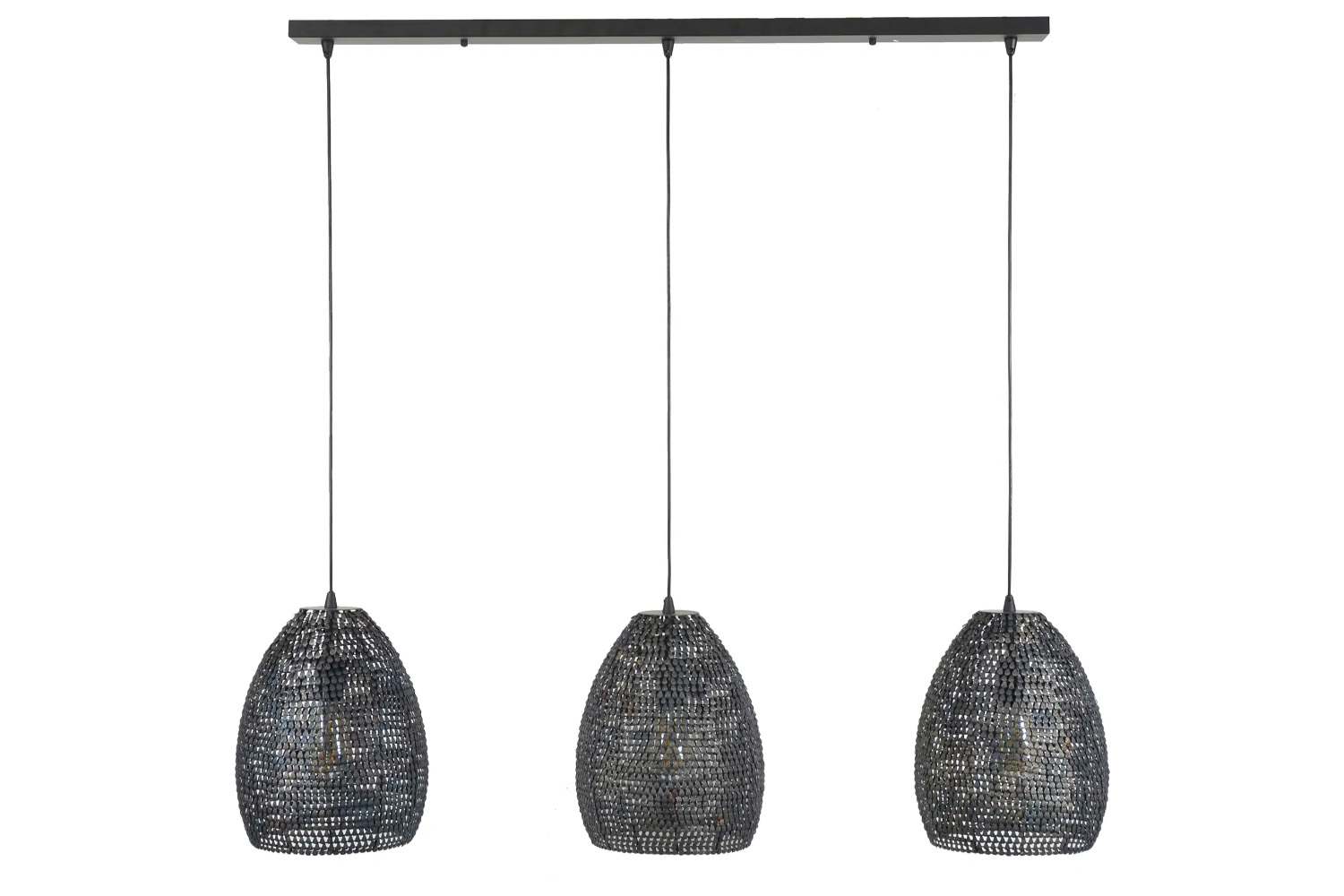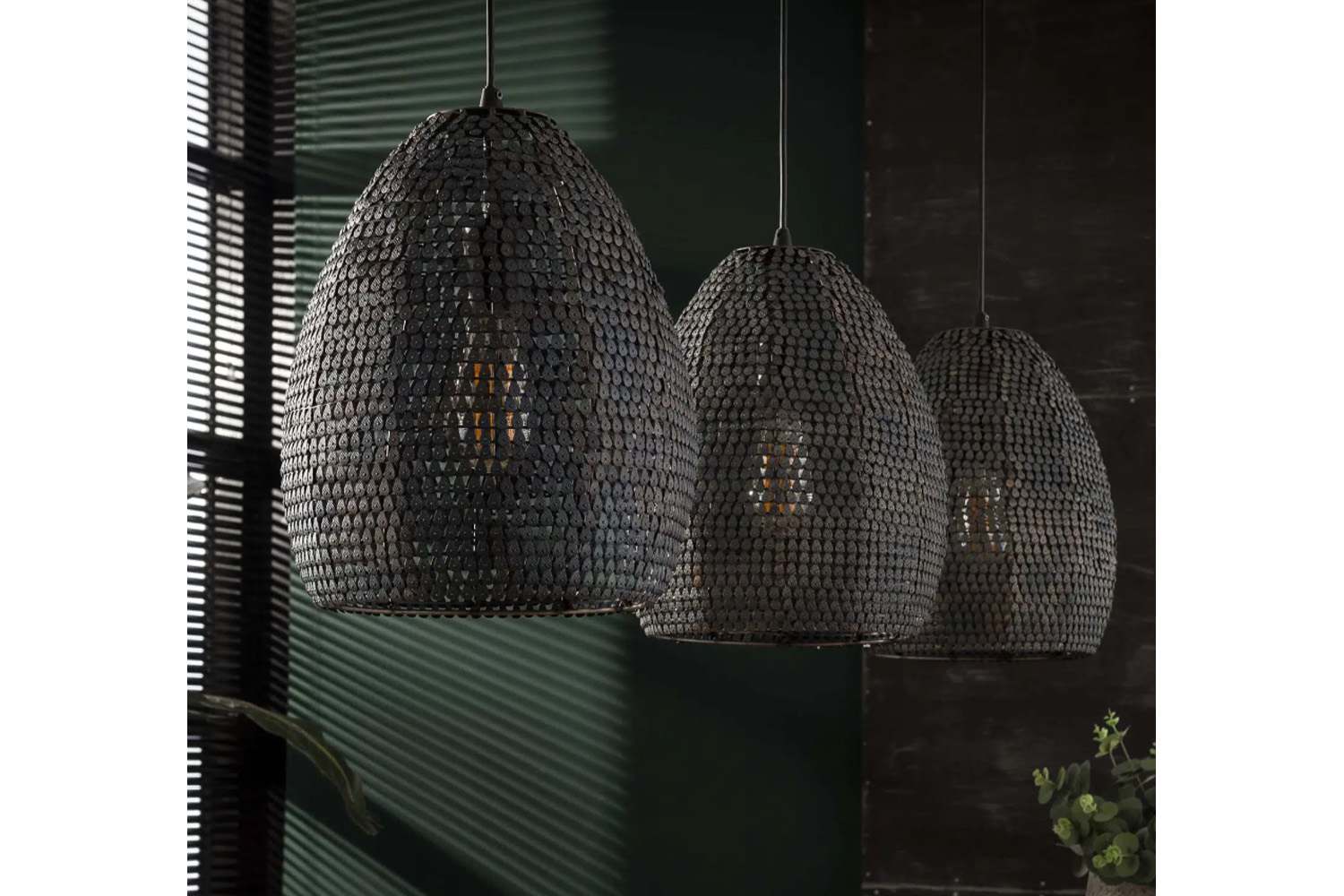 De Armor hanglamp heeft drie ovale metalen kappen. De gehele lamp is afgewerkt in een burned finish. Dit geeft een zwart/bruine kleur. De lamp is volledig handgemaakt en hierdoor is elke lamp uniek. De gaatjes maken deze lamp semi-transparant, waardoor het licht sfeervol door de ruimte wordt verdeeld. Iedere kap is afzonderlijk in hoogte verstelbaar tot 150 cm.