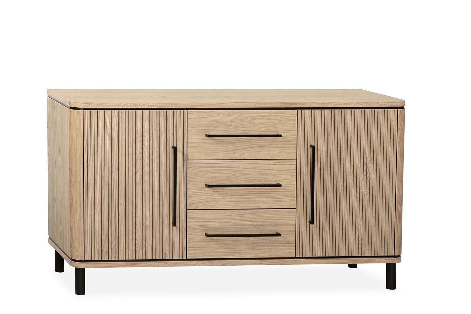 Het dressoir Medway is een stijlvolle combinatie van modern design en praktisch gebruiksgemak en vormt een waardevolle aanvulling op zowel de eetkamer als de woonkamer. Met een breedte van 150 cm biedt het volop opbergruimte dankzij twee deuren en drie laden, ideaal voor het netjes opbergen van servies, tafellinnen en alledaagse spullen.