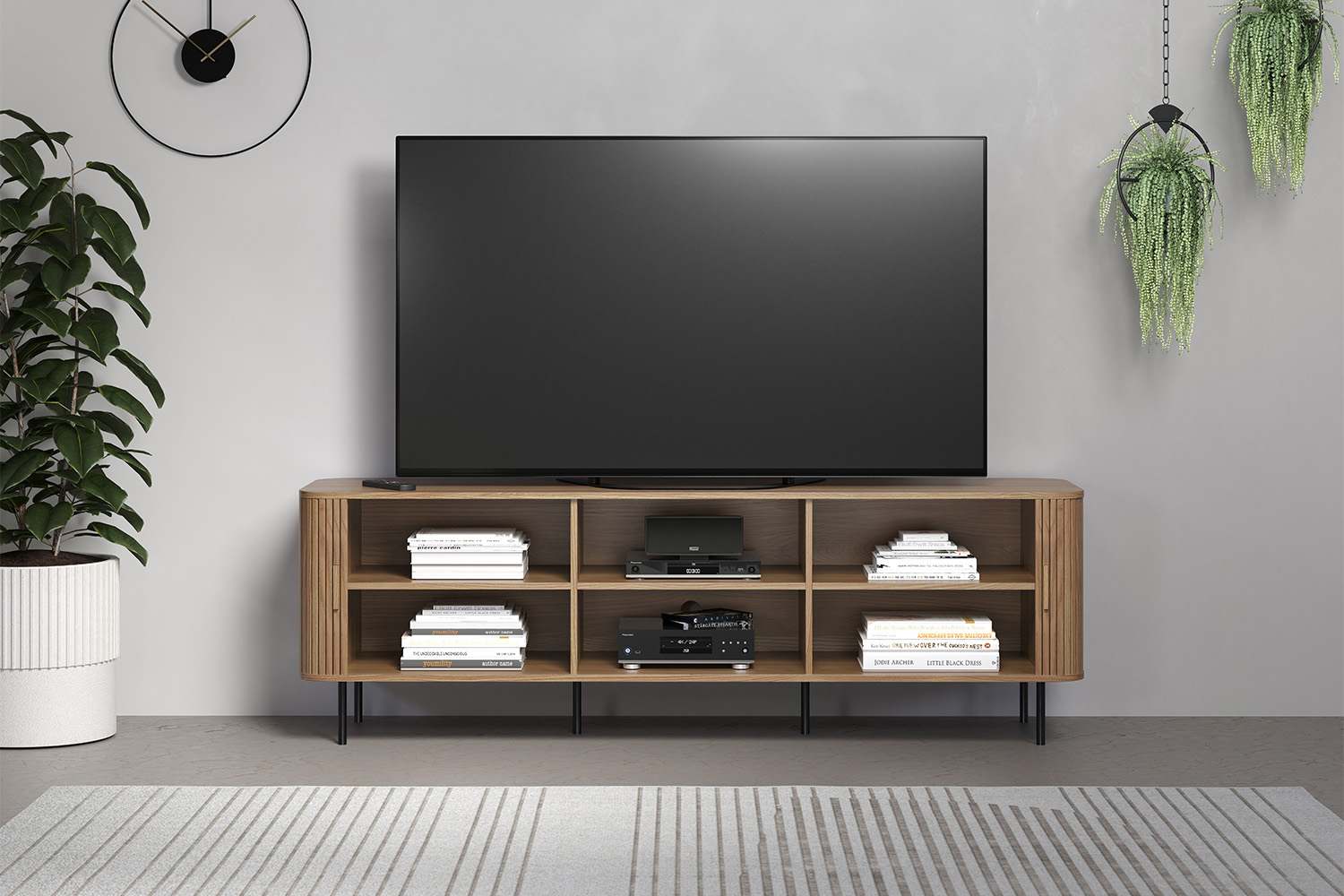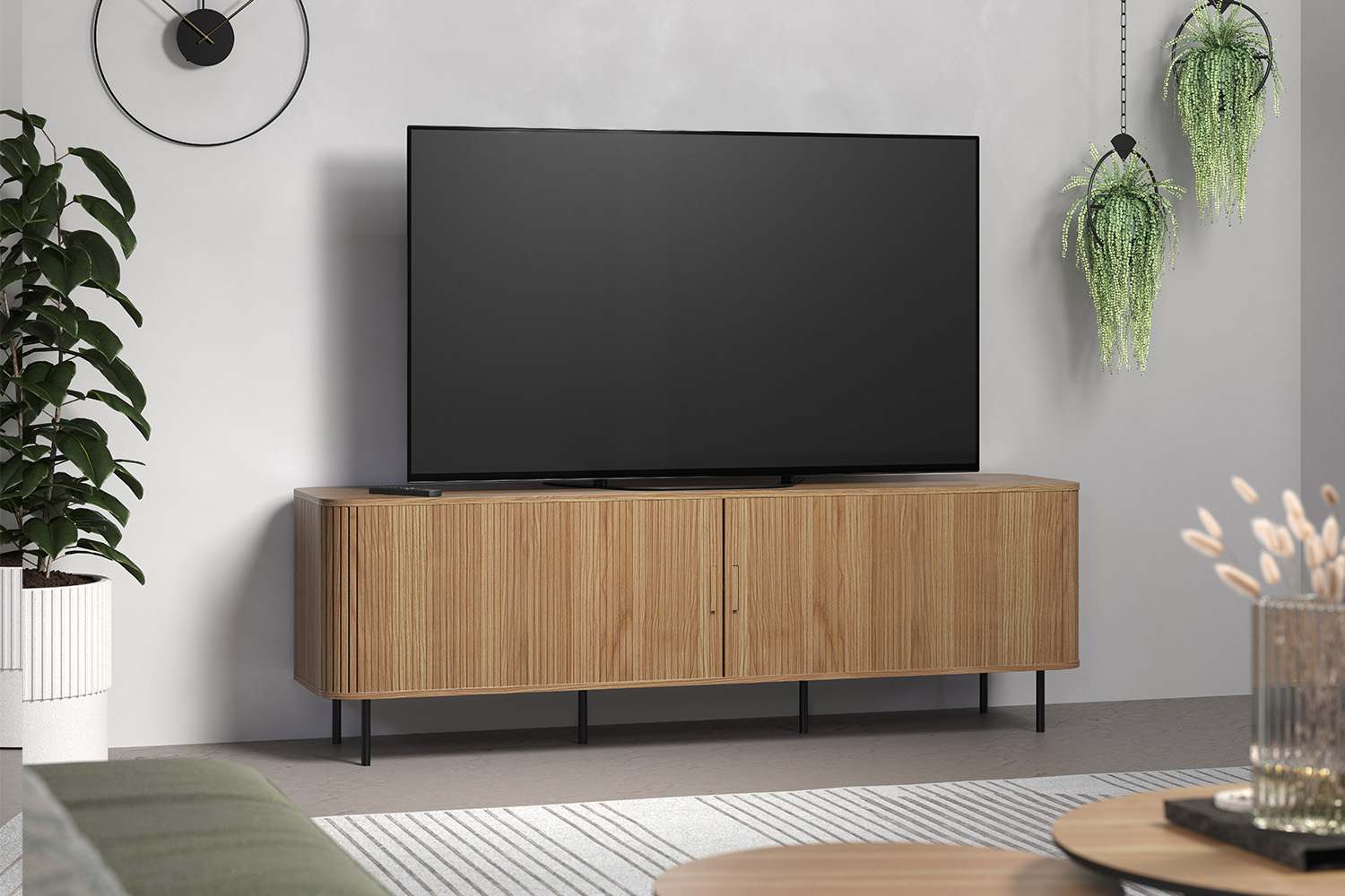 De meubelen uit het Ronin woonprogramma zijn uniek en eigentijds, dit komt onder andere door het strakke ontwerp. De meubelen beschikken over een uniek systeem, de deuren open je namelijk door deze open te rollen. Dit geeft het meubel een unieke uitstraling. Het TV meubel is uitgevoerd in een blanke eiken kleur gecombineerd met zwarte metalen poten.