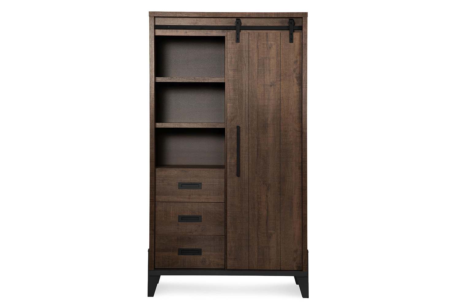 De bergkast bestaat ui één schuifdeur, drie lades en drie open vakken, bovendien zijn de lades voorzien van ladegeleiders met soft-close sluiting.