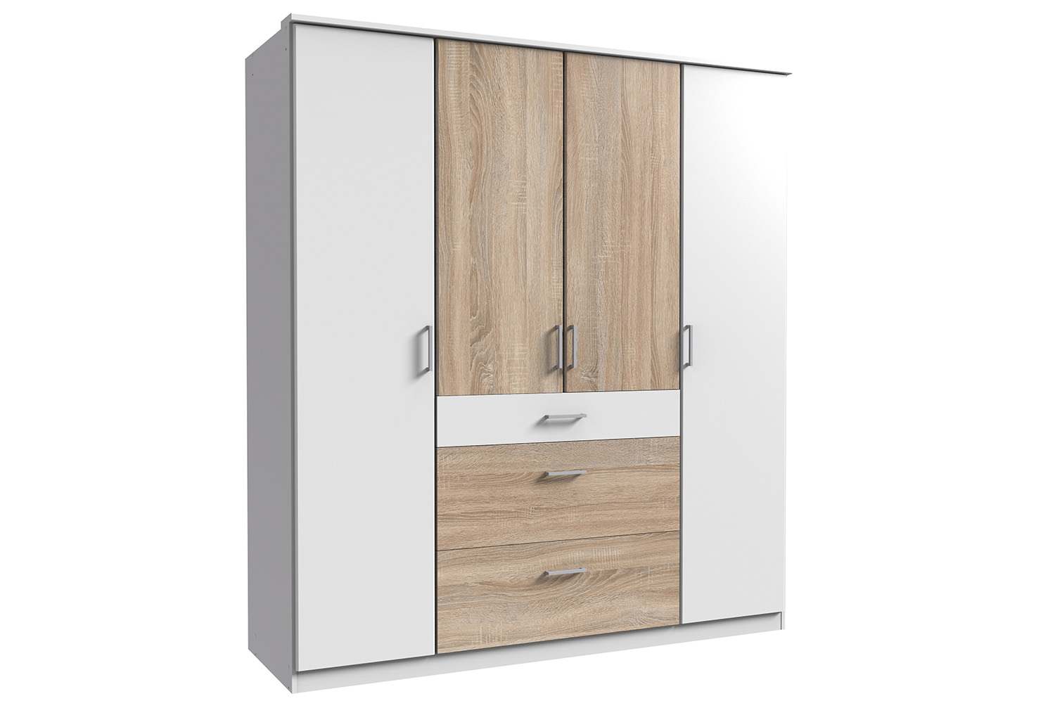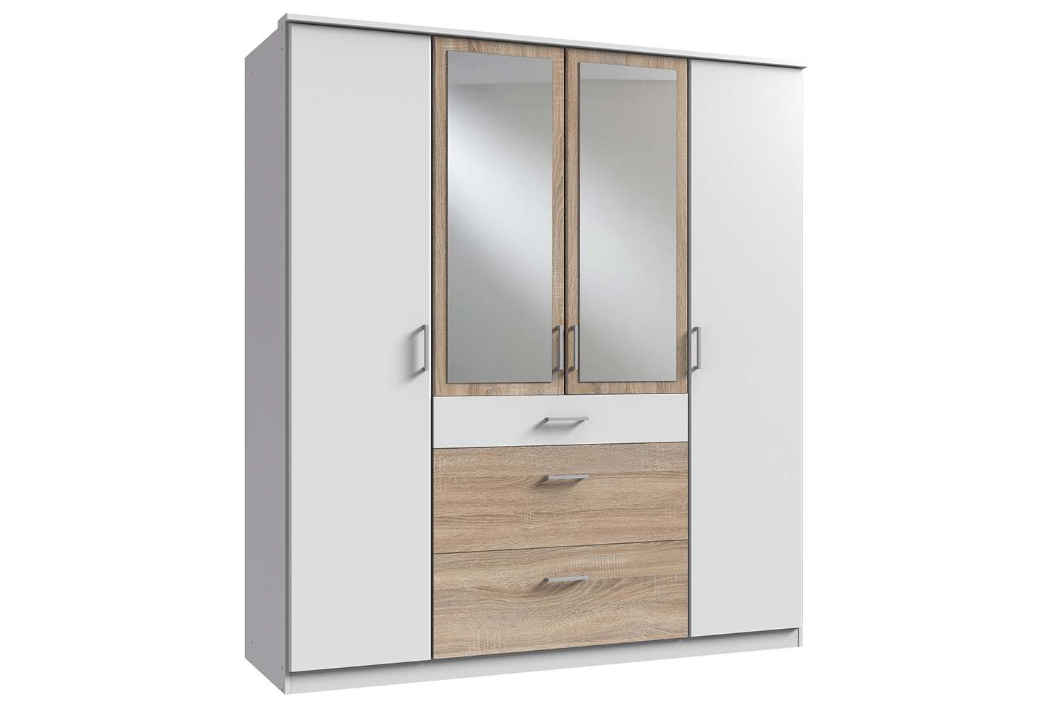 De Click kledingkast heeft vier draaideuren en drie lades. De kast past perfect in een elk interieur dankzij de vele kleurmogelijkheden. De kast kan op de middelste deuren worden voorzien met spiegels. Aan zowel de linkerkant als de rechterkant van de kast is een hangroede en legplank te vinden. De indeling van het middelste gedeelte bestaat uit meerdere legplanken en drie lades. De kledingkast is in meerdere maten te bestellen en heeft bijpassende commodes en opzetkasten beschikbaar. Vraag bij ons in de winkel naar de mogelijkheden.