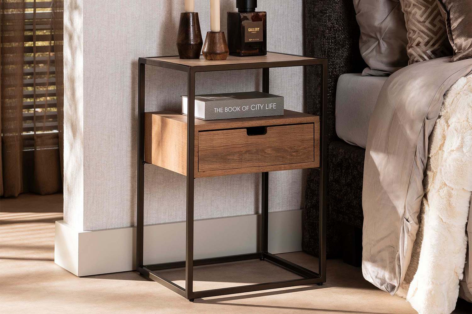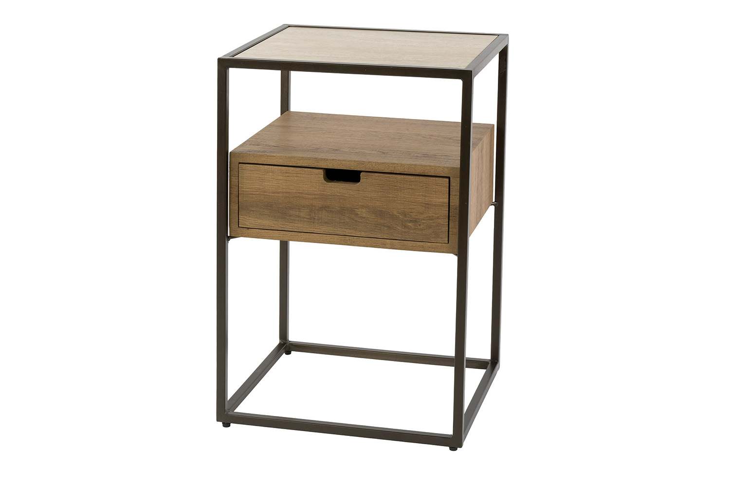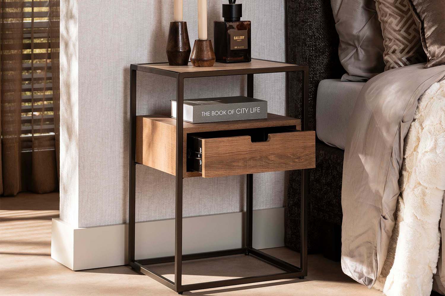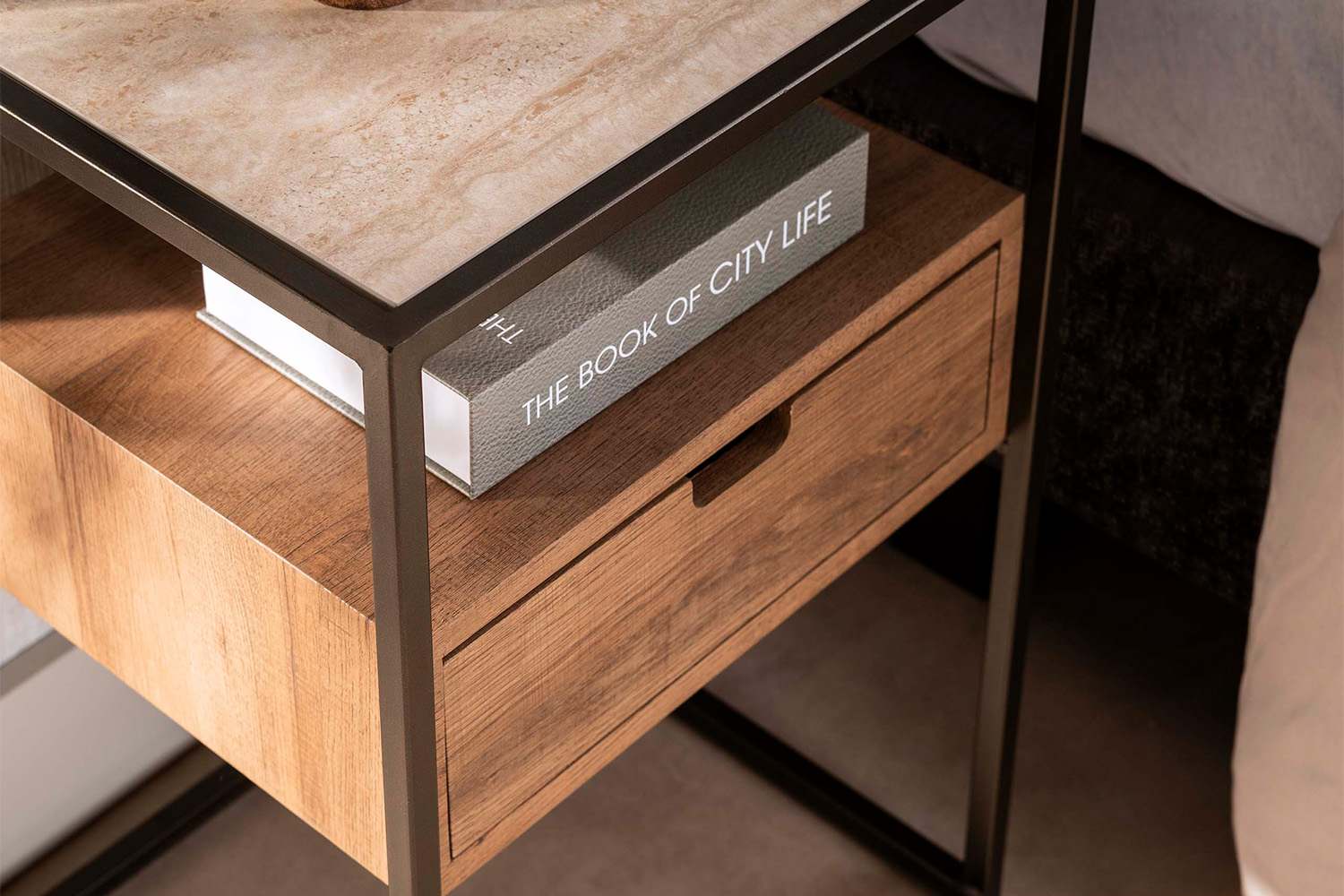 Cassetto is een nachtkastje met een bronskleurig metalen frame en een praktische lade in eikenhoutlook. Het bovenblad is gemaakt van keramiek met een travertin-uitstraling.