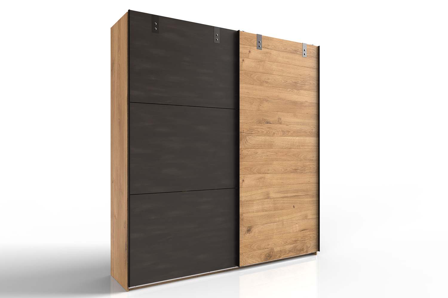 De Bronx kledingkast is voorzien van twee grote zweefdeuren en past perfect in een modern of industrieel interieur. De fronten bestaan uit drie panelen, waarvan de linker deur volledig antraciet is en de rechter een houtlook heeft. In de kast zijn twee hangroedes en legplanken te vinden. De indeling is uit te breiden door extra legplanken of een inzetladekast te kopen. Tevens is het mogelijk om tegen meerprijs een softclose systeem en verlichting toe te voegen. Bij deze kledingkast zijn bijpassende nachtkastjes, commodes en ledikanten beschikbaar. Ook is de kast in drie maten te bestellen.