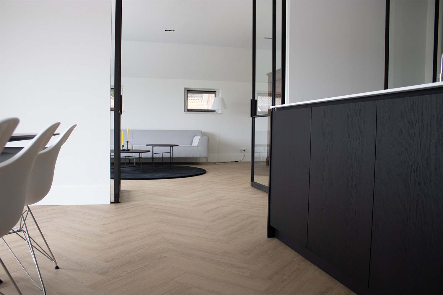 De rijke uitstraling van hout vindt u prachtig terug in onze rustige en natuurgetrouwe visgraat pvc-vloer. De planken hebben een lengte van 61,2cm en zijn 15,3 cm breed. Deze vloer is verkrijgbaar in diverse, variërend van licht tot donker. De stroken zijn afgewerkt met een extra matte toplaag van 0.55mm.